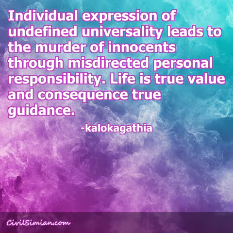 Individual expression of undefined universality leads to the murder of innocents through misdirected personal responsibility. Life is true value and consequence true guidance.